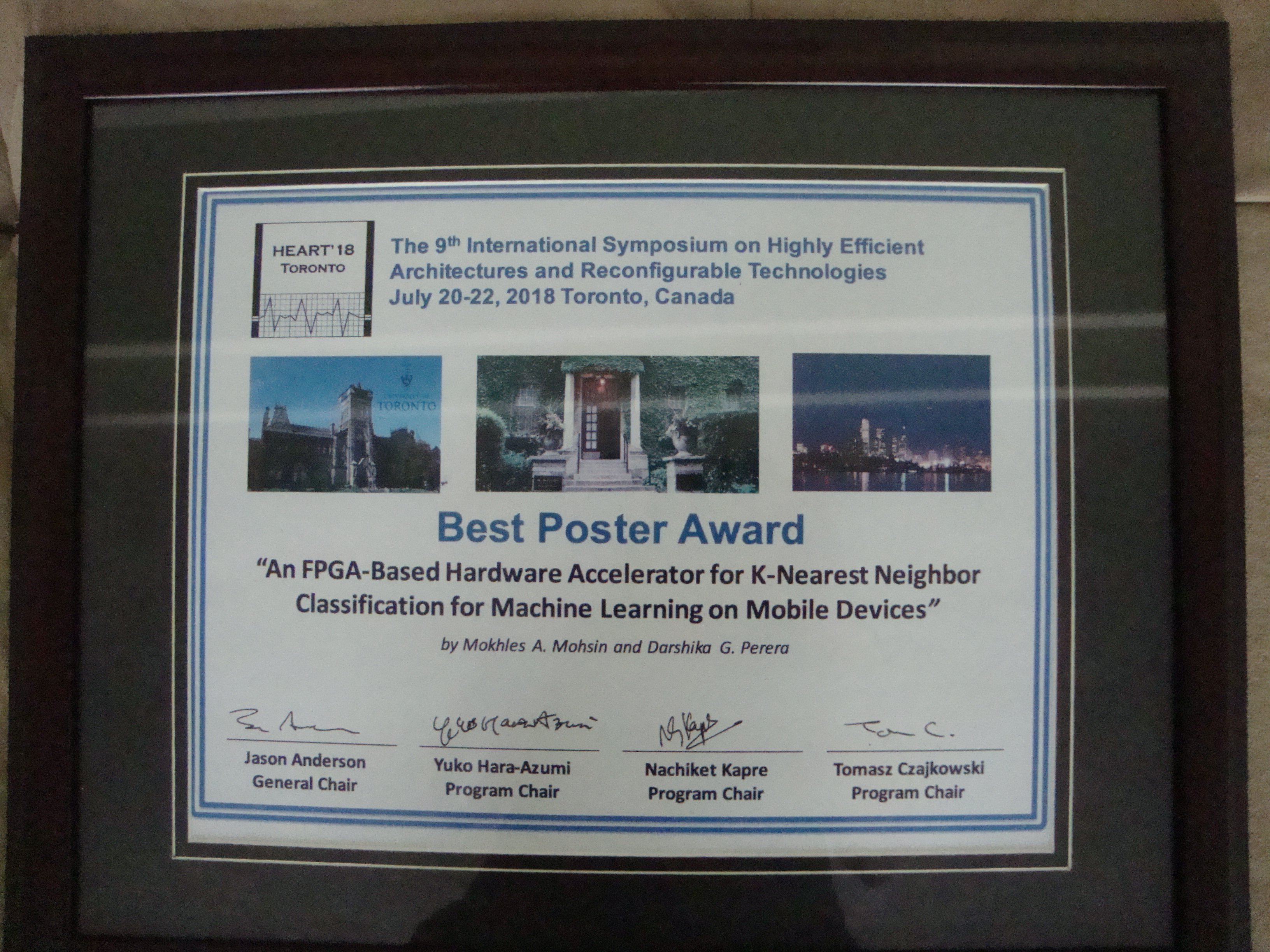 I am delighted to share this wonderful news. We won the Best Poster Paper Award at the International Symposium on HEART (Highly Efficient Accelerators and Reconfigurable Technology) 2018 in Toronto, Canada (19th-22nd June). This paper with my MSc Student Mokhles Mohsin is titled "An FPGA-Based Hardware Accelerator for K-Nearest Neighbor Classification for Machine Learning on Mobile Devices". Just came back from Toronto (22nd June), after attending the conference and presenting the paper. This pictures was taken during the Award Ceremony.