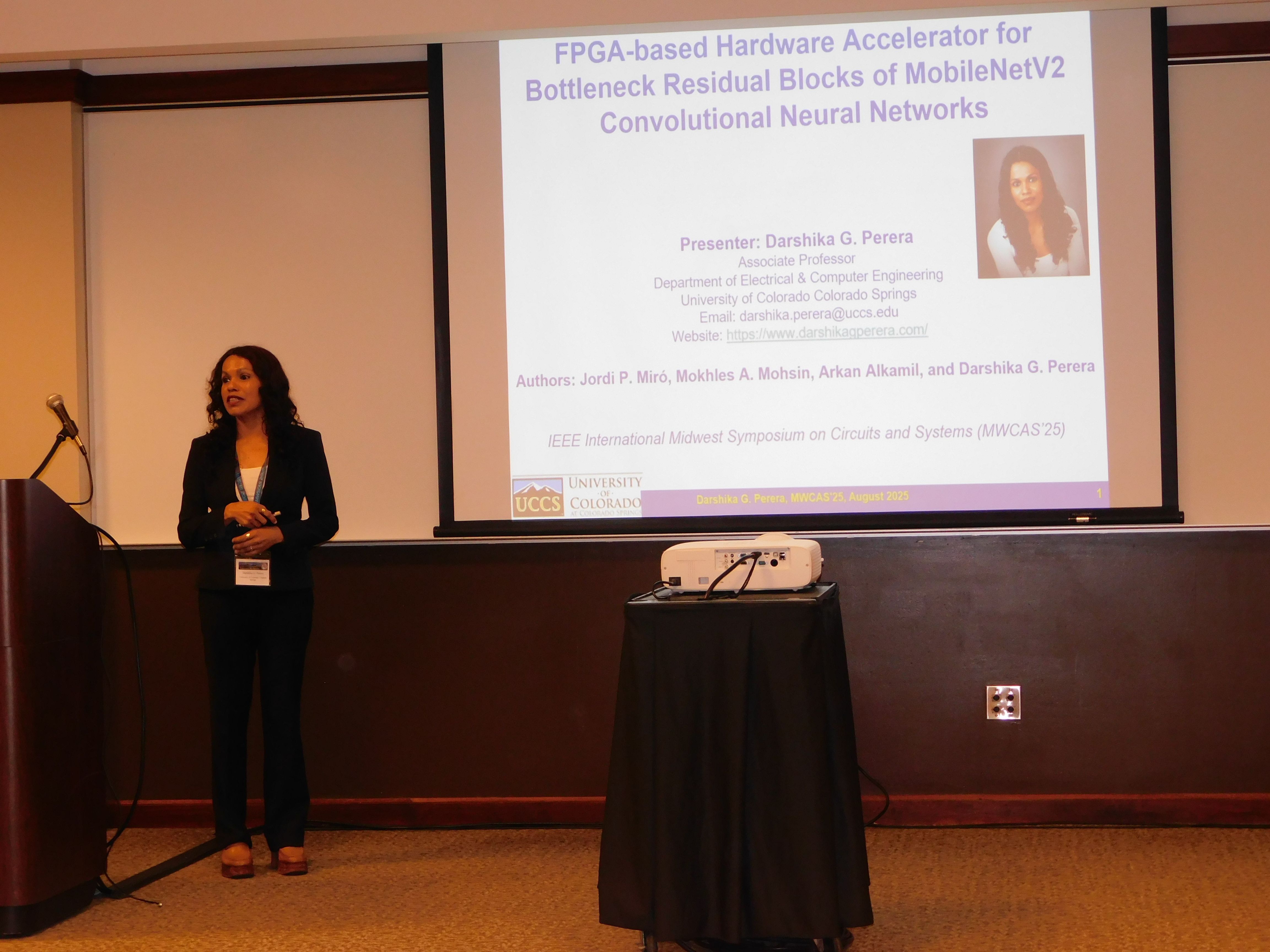 Two of our papers were accepted to the IEEE Mid-West Symposium on Circuits and Systems (MWCAS'25). (1) FPGA-based Hardware Accelerator for Bottleneck Residual Blocks of MobileNetV2 Convolutional Neural Networks. (2) High-Level Synthesis Based FPGA Accelerator for GPS Signal Image Feature Extraction. I was in Lansing, Michigan to present these papers and to serve as a session chair for one session. It was very nice to meet with many colleagues from CAS society. Congratulations to all my current/former students, who co-authored this paper. (See pictures below). More pictures of our conference participation.